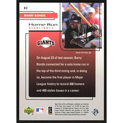 This is a 1999 Upper Deck Challengers for 70 Barry Bonds Home Run Highlights baseball card. The card is #83 and pictures show condition. Team(s): San Francisco Giants