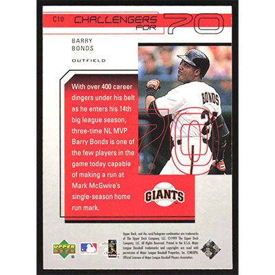 This is a 1999 Upper Deck Challengers for 70 Inserts Barry Bonds baseball card. The card is #C10 and pictures show condition. Team(s): San Francisco Giants