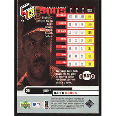 This is a 1999 Upper Deck HoloGrFX Barry Bonds baseball card. The card is #52 and pictures show condition.