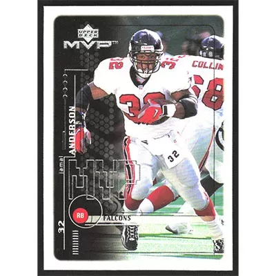 This is a 1999 Upper Deck MVP Jamal Anderson football card. The card is #8 and pictures show condition.