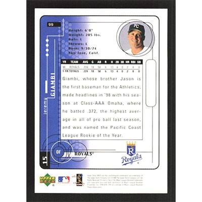 This is a 1999 Upper Deck MVP Jeremy Giambi baseball card. The card is #99 and pictures show condition.