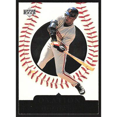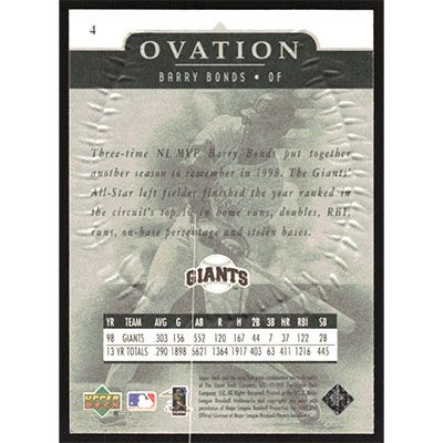 This is a 1999 Upper Deck Ovation Barry Bonds baseball card. The card is #4 and pictures show condition.