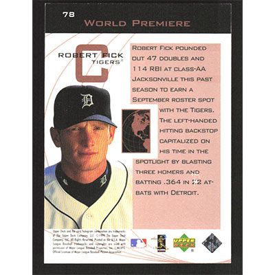 This is a 1999 Upper Deck Ovation Robert Fick World Premiere baseball card. The card is #78 and pictures show condition.
