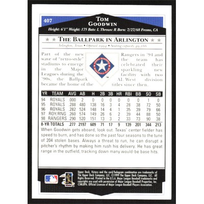 This is a 1999 Upper Deck Victory Tom Goodwin baseball card. The card is #407 and pictures show condition.