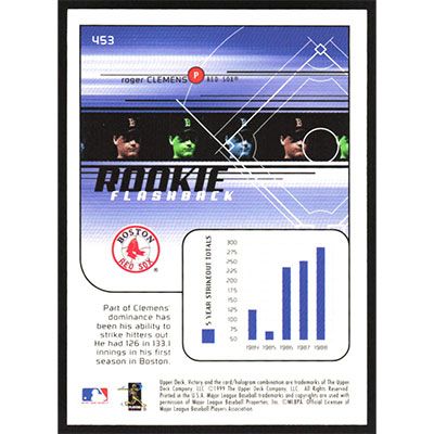 This is a 1999 Upper Deck Victory Roger Clemens Rookie Flashback baseball card. The card is #453 and pictures show condition.