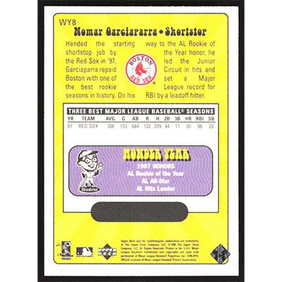 This is a 1999 Upper Deck Wonder Years Nomar Garciaparra baseball card. The card is #WY8 and pictures show condition.