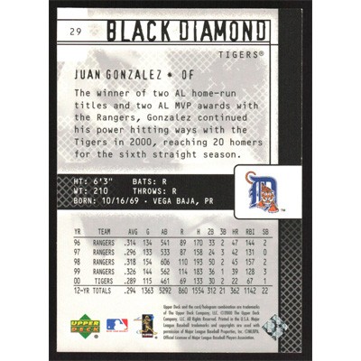 This is a 2000 Black Diamond Rookie Edition Gold Juan Gonzalez baseball card. The card is #29 and pictures show condition. This card is limited; #'d 0304/1000.
