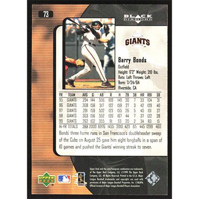 This is a 2000 Black Diamons Barry Bonds baseball card. The card is #73 and pictures show condition.