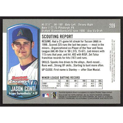 This is a 2000 Bowman Chrome Jason Conti baseball card. The card is #209 and pictures show condition.