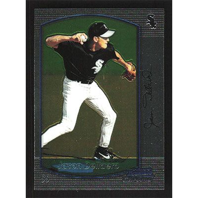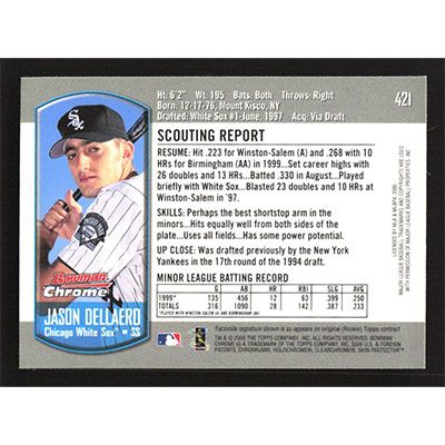 This is a 2000 Bowman Chrome Jason Dellaero baseball card. The card is #421 and pictures show condition.