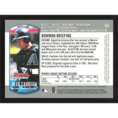 This is a 2000 Bowman Chrome Draft Alex Cabrera baseball card. The card is #104 and pictures show condition. Team(s): Arizona Diamondbacks Rookie Card (RC)