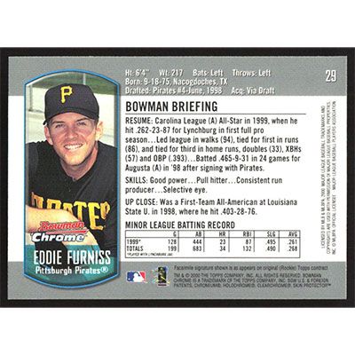 This is a 2000 Bowman Chrome Draft Eddie Furniss baseball card. The card is #29 and pictures show condition. Team(s): Pittsburgh Pirates Rookie Card (RC)
