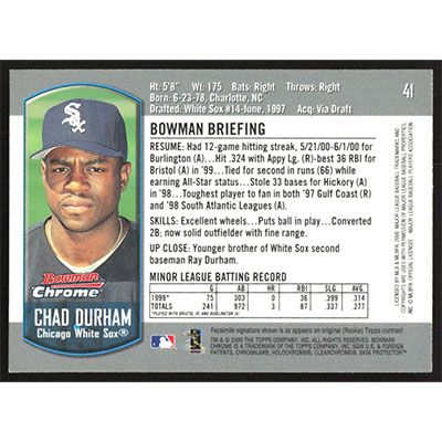 This is a 2000 Bowman Chrome Draft Chad Durham baseball card. The card is #41 and pictures show condition. Team(s): Chicago White Sox Rookie Card (RC)