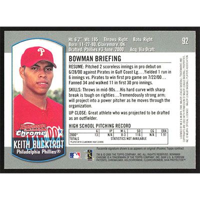 This is a 2000 Bowman Chrome Draft Keith Bucktrot baseball card. The card is #92 and pictures show condition. Team(s): Philadelphia Phillies Rookie Card (RC)