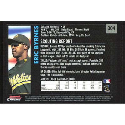 This is a 2000 Bowman Chrome Retro/Future Eric Byrnes UER/Bo Porter baseball card. The card is #304 and pictures show condition. Team(s): Oakland Athletics Rookie Card (RC)