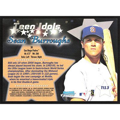 This is a 2000 Bowman Chrome Teen Idols Sean Burroughs baseball card. The card is #TI13 and pictures show condition.