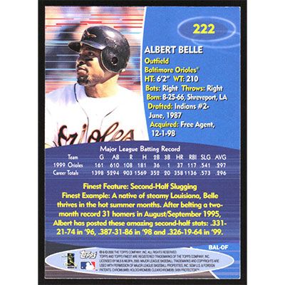 This is a 2000 Finest Albert Belle baseball card. The card is #222 and pictures show condition.