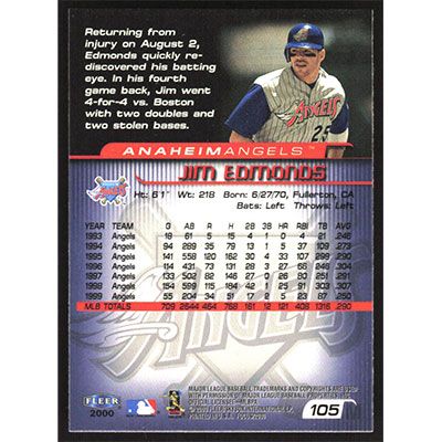 This is a 2000 Fleer Focus Jim Edmonds baseball card. The card is #105 and pictures show condition.