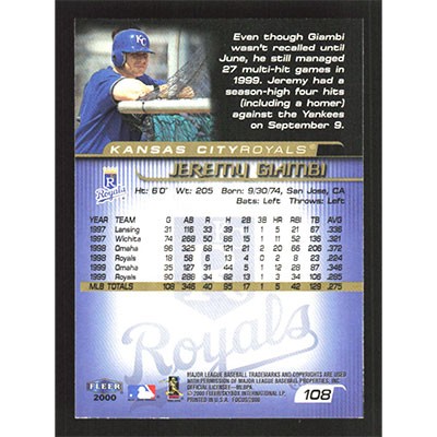 This is a 2000 Fleer Focus Jeremy Giambi baseball card. The card is #108 and pictures show condition.