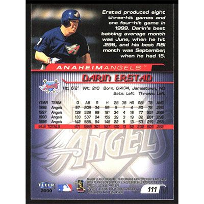 This is a 2000 Fleer Focus Darin Erstad baseball card. The card is #111 and pictures show condition.