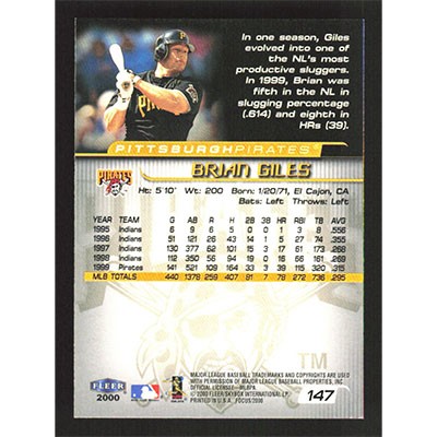 This is a 2000 Fleer Focus Brian Giles baseball card. The card is #147 and pictures show condition.