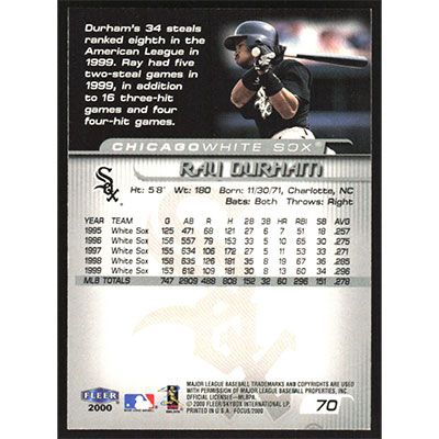 This is a 2000 Fleer Focus Ray Durham baseball card. The card is #70 and pictures show condition.