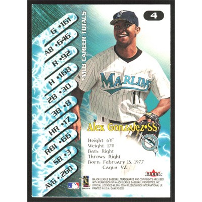 This is a 2000 Fleer Gamers Alex Gonzalez baseball card. The card is #4 and pictures show condition.