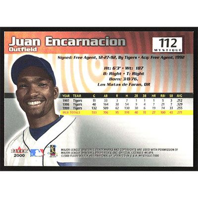 This is a 2000 Fleer Mystique Juan Encarnacion baseball card. The card is #112 and pictures show condition.