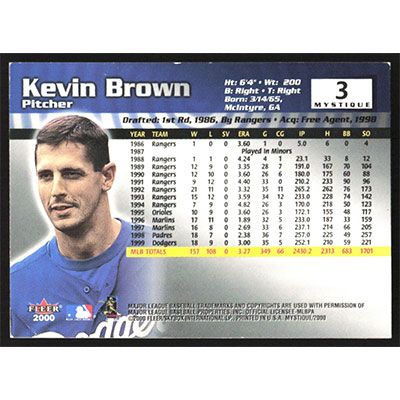 This is a 2000 Fleer Mystique Kevin Brown baseball card. The card is #3 and pictures show condition.