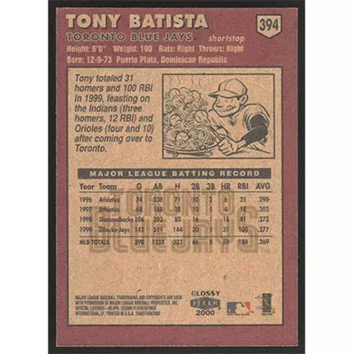 This is a 2000 Fleer Tradition Glossy Tony Batista baseball card. The card is #394 and pictures show condition.
