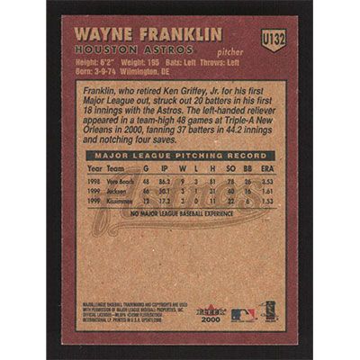 This is a 2000 Fleer Tradition Update Wayne Franklin baseball card. The card is #U132 and pictures show condition. Team(s): Houston Astros Rookie Card (RC)