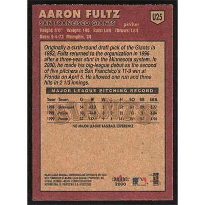 This is a 2000 Fleer Tradition Update Aaron Fultz baseball card. The card is #U25 and pictures show condition. Team(s): San Francisco Giants Rookie Card (RC)