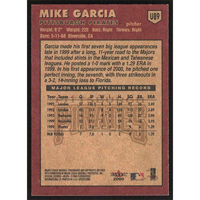 This is a 2000 Fleer Tradition Update Mike Garcia baseball card. The card is #U89 and pictures show condition.