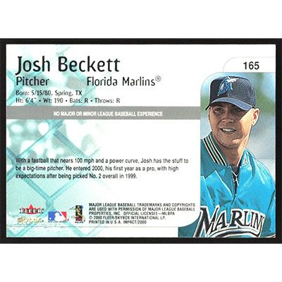 This is a 2000 Impact Josh Beckett Prospects baseball card. The card is #165 and pictures show condition.