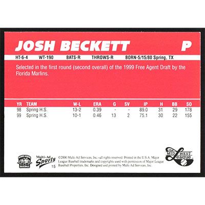This is a 2000 Multi-Ad Midwest League Top Prospects Josh Beckett baseball card. The card is #NNO and pictures show condition. Team(s): Kane County Cougars