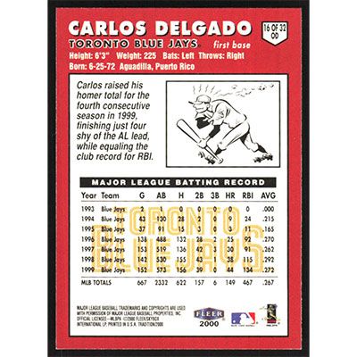This is a 2000 Opening Day 2K Carlos Delgado Fleer baseball card. The card is #16 and pictures show condition.