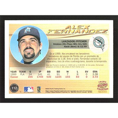 This is a 2000 Pacific Crown Collection Alex Fernandez baseball card. The card is #112 and pictures show condition.