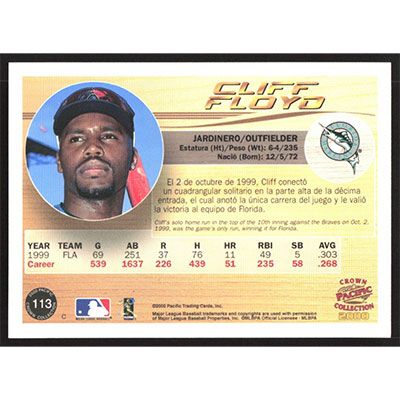 This is a 2000 Pacific Crown Collection Cliff Floyd baseball card. The card is #113 and pictures show condition.