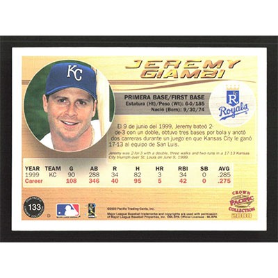 This is a 2000 Pacific Crown Collection Jeremy Giambi baseball card. The card is #133 and pictures show condition.