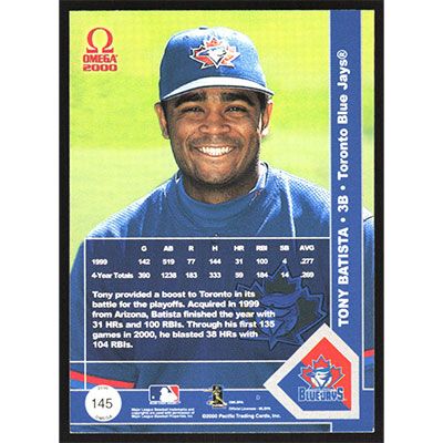 This is a 2000 Pacific Omega Tony Batista baseball card. The card is #145 and pictures show condition.