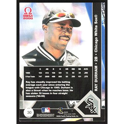 This is a 2000 Pacific Omega Ray Durham baseball card. The card is #30 and pictures show condition.