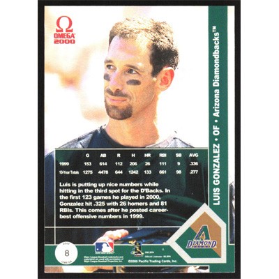 This is a 2000 Pacific Omega Luis Gonzalez baseball card. The card is #8 and pictures show condition.