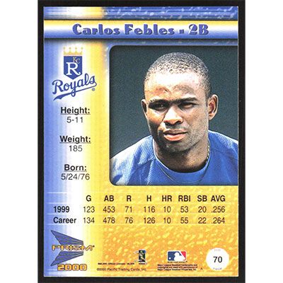 This is a 2000 Pacific Prism Carlos Febles baseball card. The card is #70 and pictures show condition.