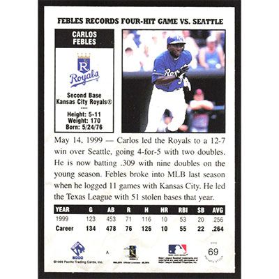 This is a 2000 Private Stock Carlos Febles baseball card. The card is #69 and pictures show condition.