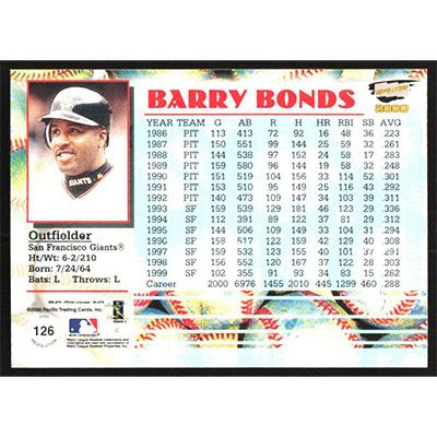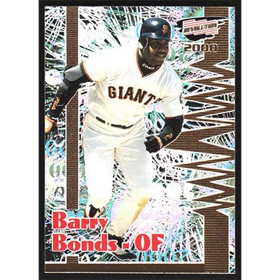 This is a 2000 Revolution Barry Bonds baseball card. The card is #126 and pictures show condition.