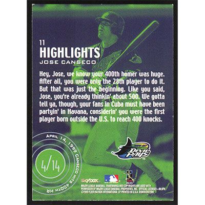 This is a 2000 SkyBox Dominion Jose Canseco Highlights baseball card. The card is #11 and pictures show condition.