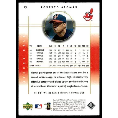 This is a 2000 SP Authentic Roberto Alomar baseball card. The card is #13 and pictures show condition.