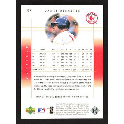 This is a 2000 SP Authentic Dante Bichette baseball card. The card is #174 and pictures show condition.
