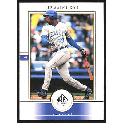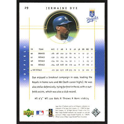 This is a 2000 SP Authentic Jermaine Dye baseball card. The card is #29 and pictures show condition.