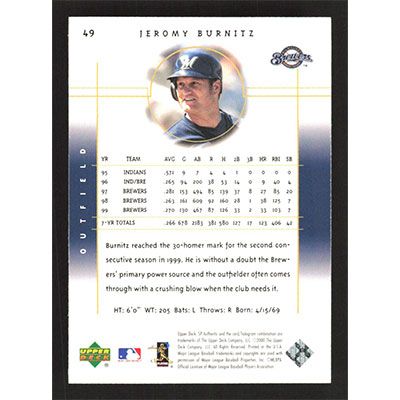 This is a 2000 SP Authentic Jeromy Burnitz baseball card. The card is #49 and pictures show condition.